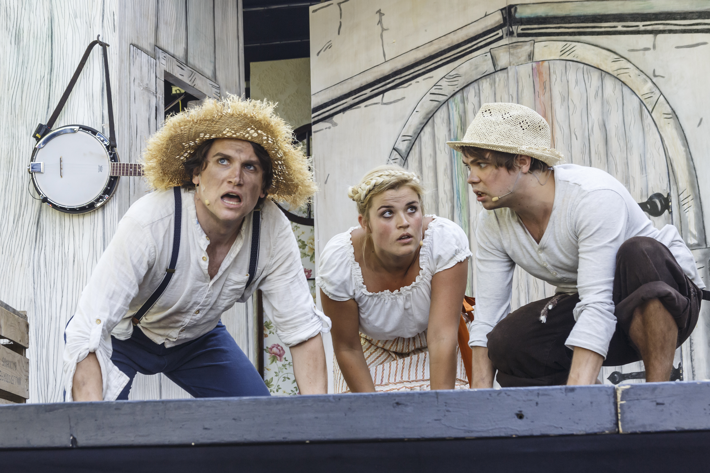 KULTURmobil_2018_Tomsawyer033 Veröffentlicht Juni 19 mit 2303 × 1535 in Herzlich Willkommen! v. l.: Kolja Heiß (Huckleberry Finn), Henriette Heine (Becky Thatcher), Julian Häußler (Tom Sawyer)